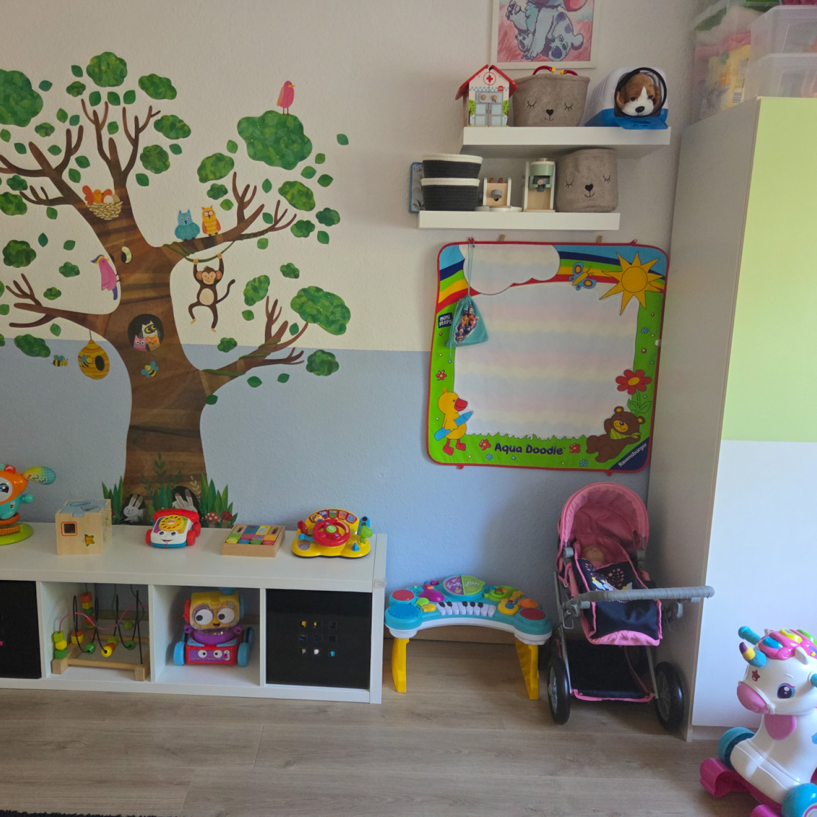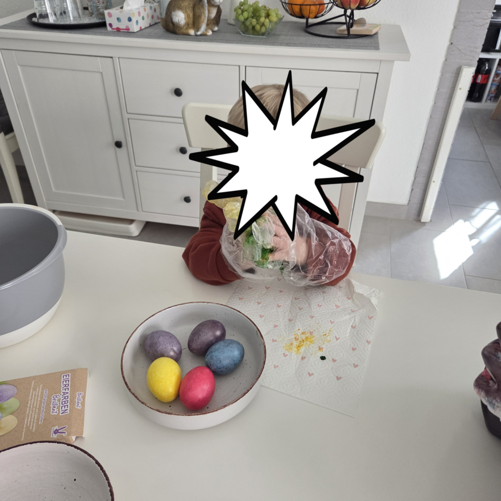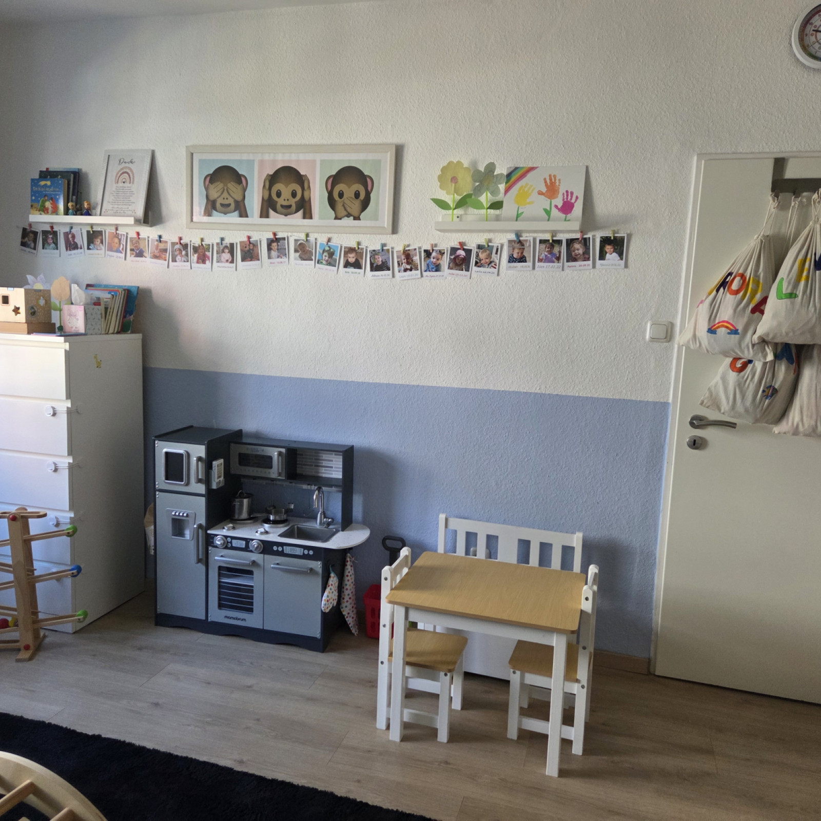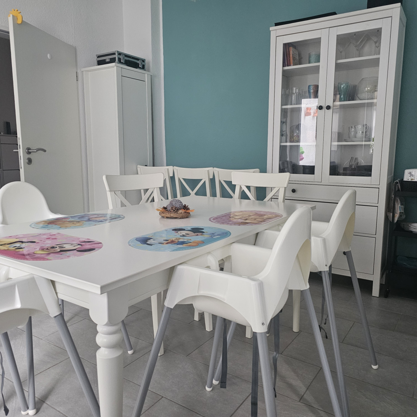 Auch nutzen wir den großen Tisch im Esszimmer zum gemeinsamen Malen und basteln oder zum Bauen einer Höhle. Auch der große Flur kann gerne von den Kindern zum spielen und toben genutzt werden. Hinter dem Esszimmer befindet sich die Küche. Diese ist mit einem Türgitter vom Esszimmer getrennt ist, damit kein Kind unbeauf-sichtigt in die Küche kommt und sich dort verletzen kann.