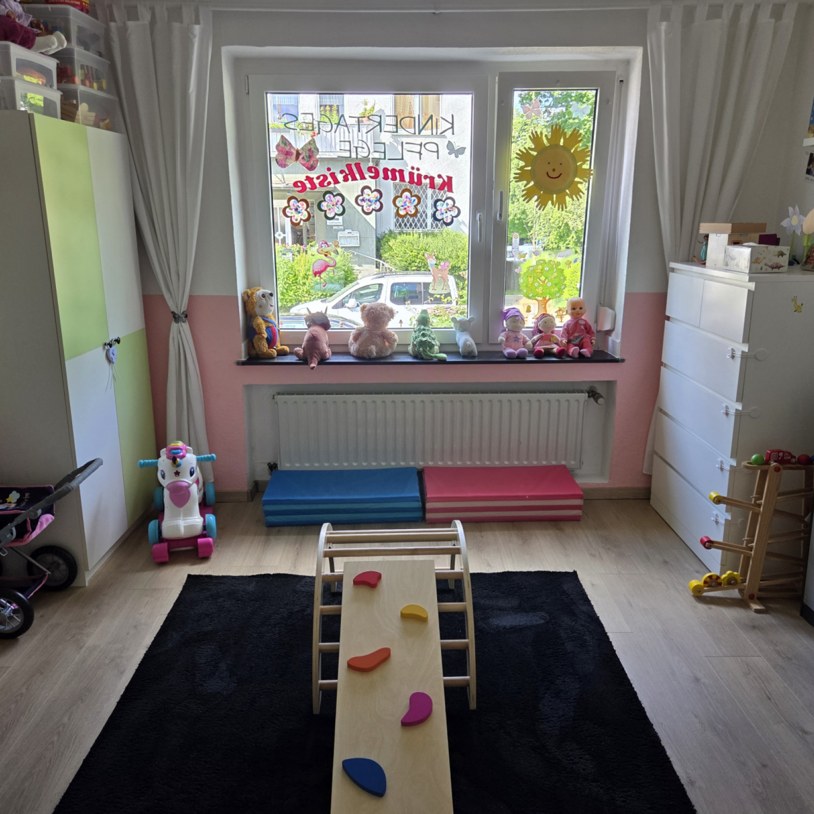 Die liebevoll eingerichteten Räumlichkeiten zur Betreuung befinden sich hier in unserer Erdgeschosswohnung. Zur Verfügung steht ein extra eingerichtetes Spielzimmer mit verschiedenen Themenbereichen wie zum Beispiel Kinderküche und Verkleidungskiste (Rollenspiel), Bücherecke sowie Bastel- und Malecke (Kreativität). Ein vielfältiges Angebot an altersgerechtem Spielzeug und Büchern laden zum spielen und entdecken ein. Alle Räume sind dabei selbstverständlich kindgerecht eingerichtet (Fenster -und Steckdosensicherung, keine zugänglichen Putzmittel sowie ein Türschutzgitter zur Küche).