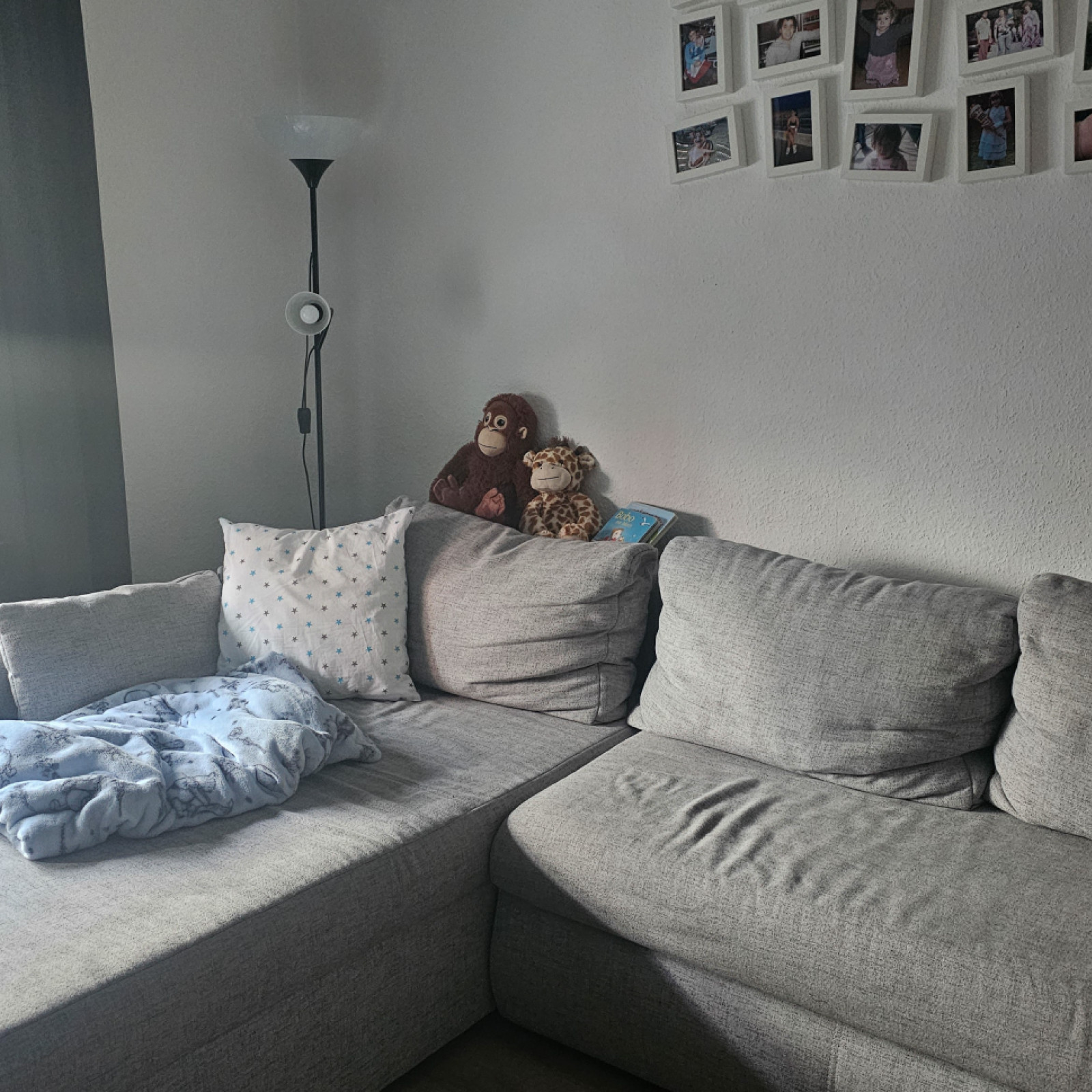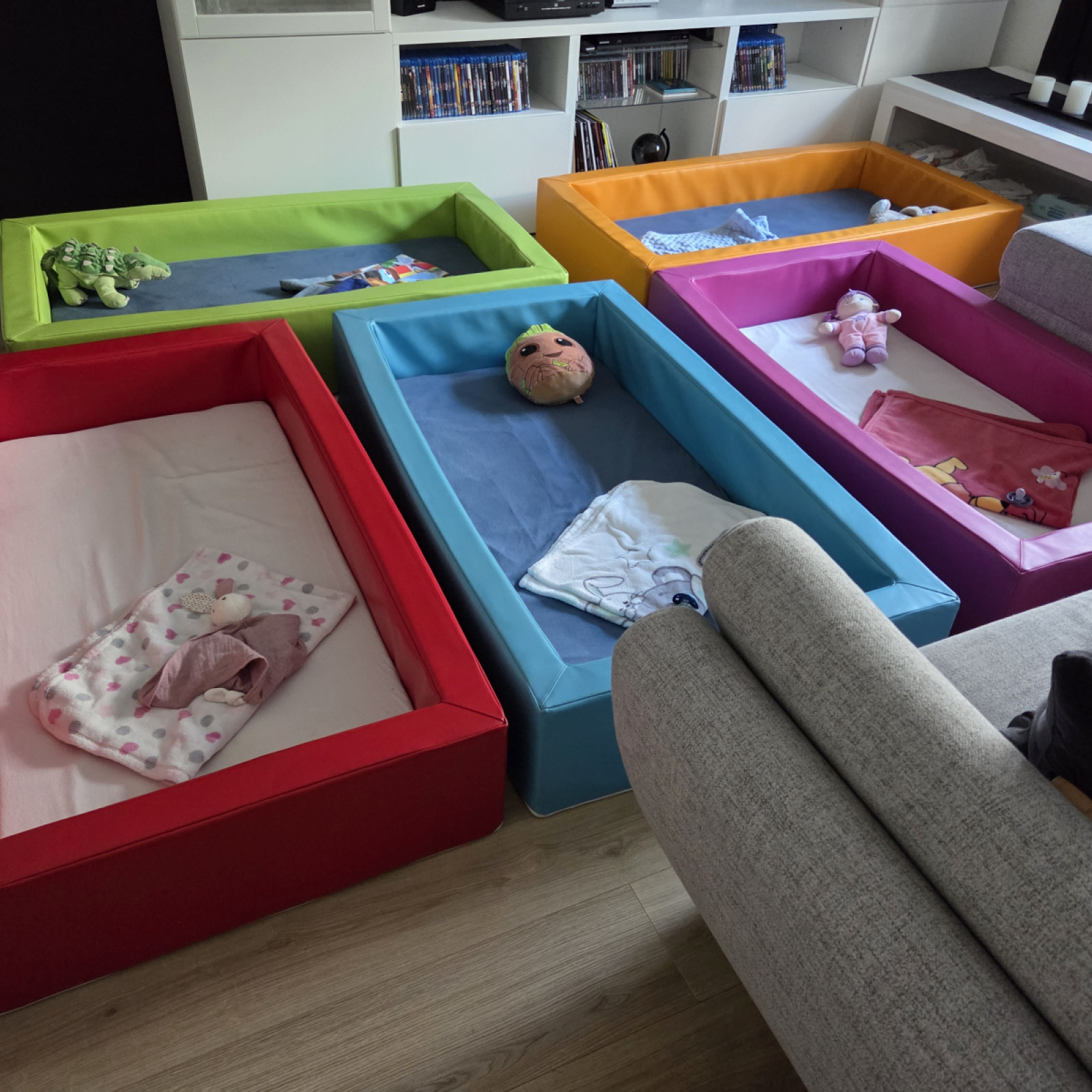 Gegenüber vom Spielzimmer befindet sich das Wohnzimmer, welches den Kindern auch als Rückzugsmöglichkeit zur Verfügung steht. Hier können die Kinder auf der Couch entspannen, ein Hörspiel oder Musik anhören, kuscheln oder sich in Ruhe ein Buch anschauen. Hier im Wohnzimmer wird auch der Mittagsschlaf gehalten, beziehungsweise haben die Kinder die Möglichkeit sich zu entspannen oder auszuruhen wenn sie keinen Mittagsschlaf machen. Jedes Kind hat sein eigenes Bett und wenn ein Kind nicht alleine in den Schlaf findet, begleite ich es dabei (Hand halten, ein Schlaflied singen oder ähnliches).
