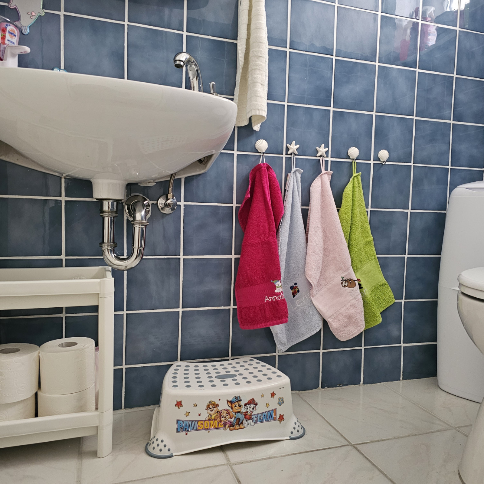 Außerdem gibt es für die Tageskinder ein kleines Bad. Hier können sich die Kinder selbstständig mit Zuhilfenahme eines Hockers die Hände waschen. Dabei hat auch hier jedes Kind sein eigenes Handtuch und wenn es soweit ist, können die Kinder hier auch auf die Toilette gehen.
